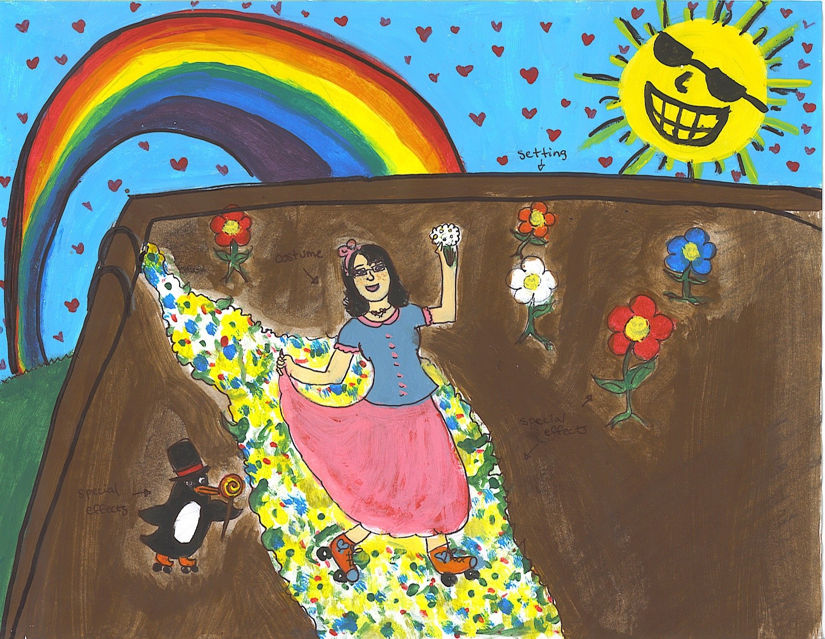 The assignment I painted for Drama class. (Yes that is a roller skating penguin.)